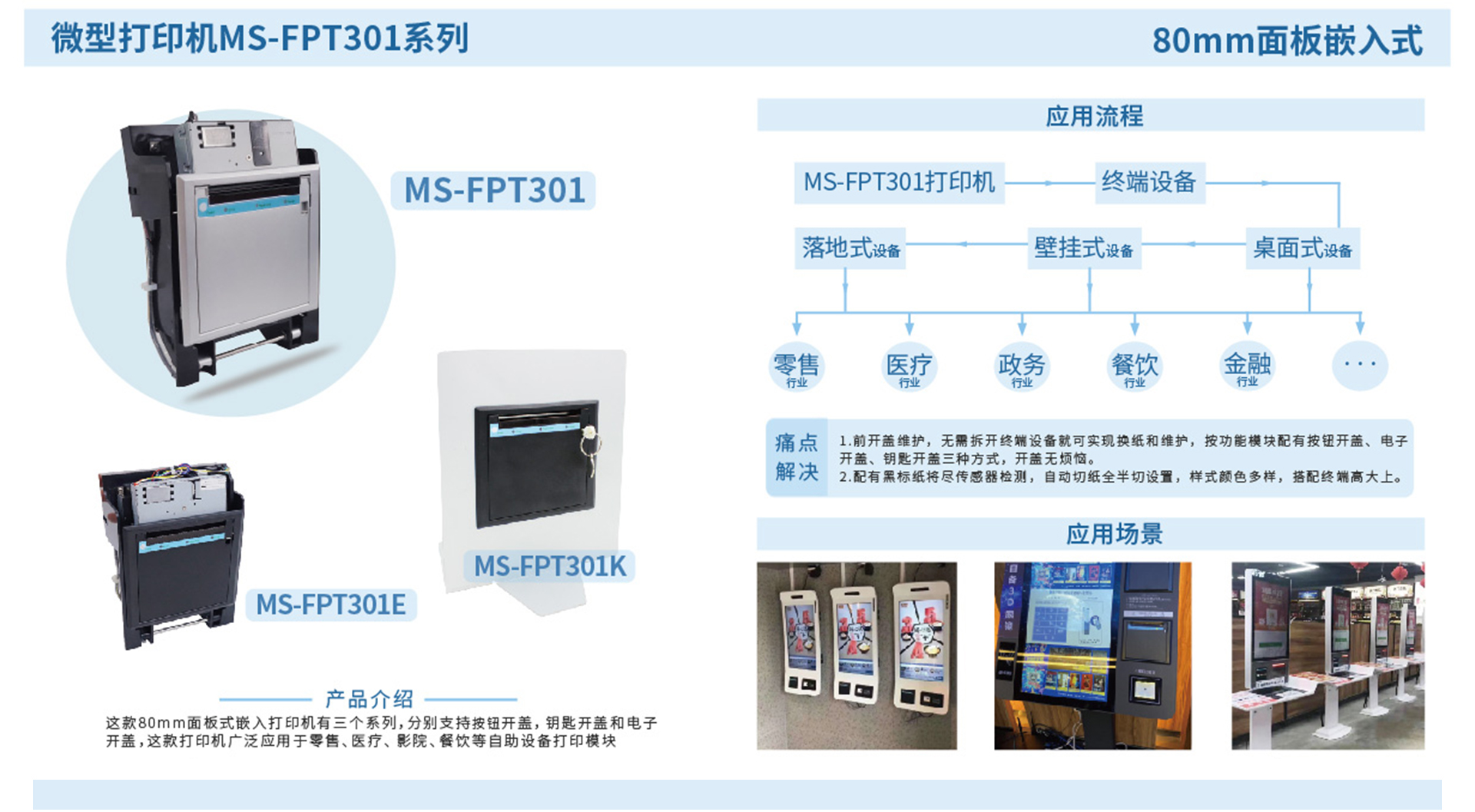 美松MASUNG微型打印機(jī)廣泛應(yīng)用在落地式、壁掛式、桌面式自助終端設(shè)備上,實(shí)現(xiàn)打印票據(jù)功能的模塊。在金融行業(yè),微型打印機(jī)可嵌入ATM機(jī)、自助繳費(fèi)機(jī)、自助存取款機(jī)提供打印需求;在醫(yī)療服務(wù)行業(yè),微型打印機(jī)嵌入自助掛號(hào)繳費(fèi)機(jī)、自助取單查詢機(jī)提供打印模塊;在消費(fèi)零售行業(yè),微型打印機(jī)為自助售貨機(jī)、自助加油機(jī)、自助點(diǎn)餐機(jī)、自助取票機(jī),新零售自助結(jié)算機(jī)等自助設(shè)備提供排號(hào)打印的功能;在公共服務(wù)行業(yè),微型打印機(jī)適配AFC系統(tǒng),自助圖書館服務(wù)機(jī)、自助稅務(wù)機(jī)等終端設(shè)備,提供打印模塊。