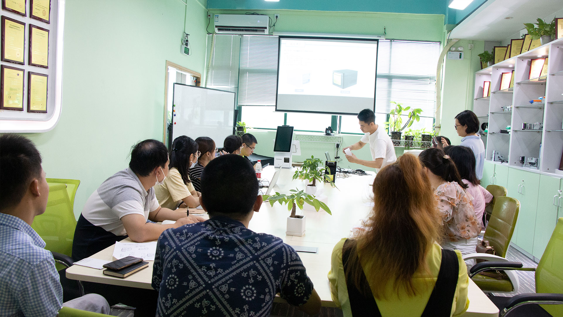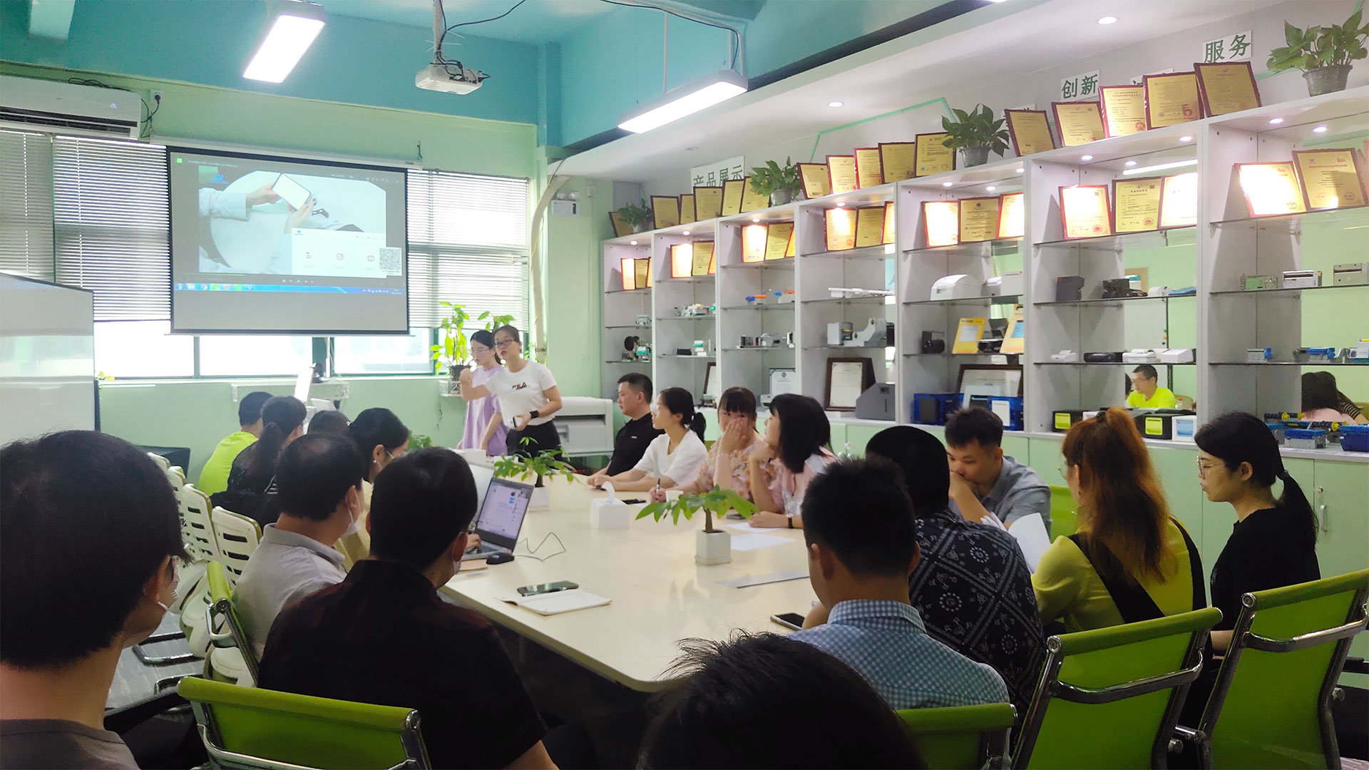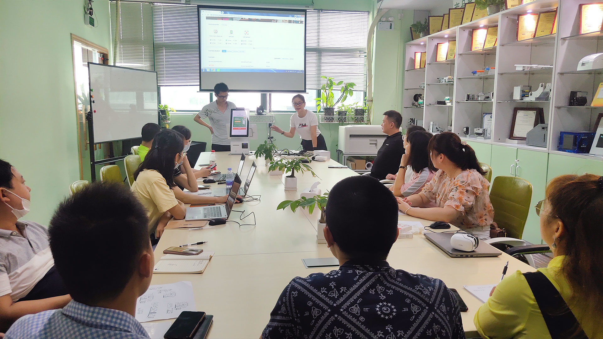 產品線的發(fā)展應當把質量工作放在與市場開發(fā)同等重要位置。守住質量紅線、提高質量水平是美松集團的立足之本;做好專業(yè)技術培訓、統(tǒng)一技術規(guī)范是向客戶提供高質量服務的必要條件。在產品介紹環(huán)節(jié),市場運營專員熊艷艷、軟件工程師劉方以及研發(fā)工程師楊罡分別對產品進行了詳細的演示與講解。同時結合實際案例與參會人員進行了積極互動和交流分享。來自長沙公司的外貿負責人Amy就手持移動打印產品、智慧門店商超方案、桌面POS打印機使用及疑問,技術人員憑借其豐富的經驗、扎實的專業(yè)知識以及對公司產品的深刻了解,讓大家對每一款產品的性能特點、使用方法、注意事項等有了更為全面的認識,并針對實際工作中常見的疑惑一一提問、擊破。短短半天的培訓針對性強,效果顯著,大家紛紛加入討論,認真做好筆記。