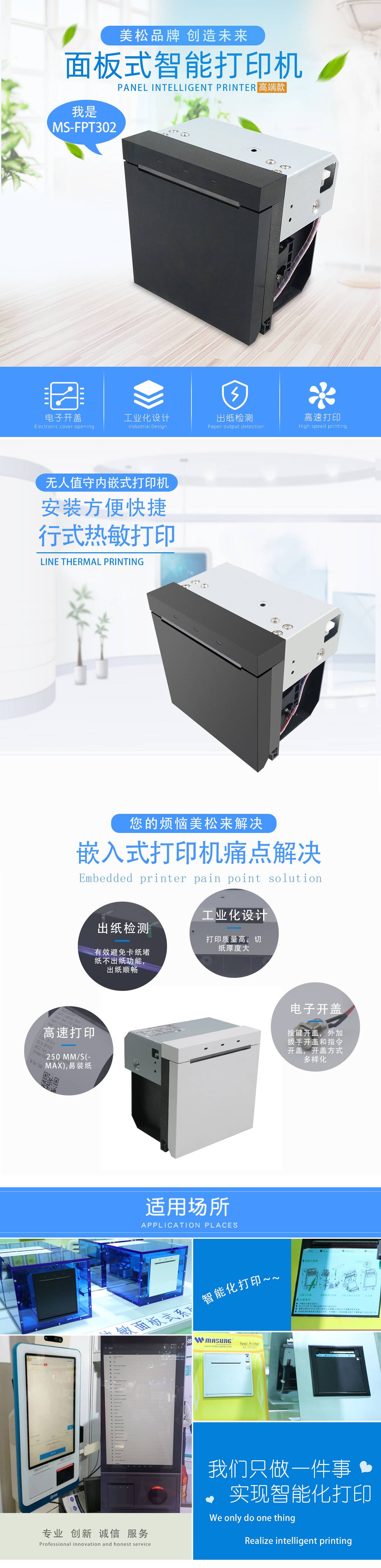 美松MASUNG自主研發(fā)80mm自動切紙工業(yè)化設(shè)計打印機 1.高速熱敏打印、噪聲低、可靠性強、切紙厚度大等特點 2.MS-FPT302定位孔可安裝在側(cè)、前、后三面,安裝維修方便快捷 3.易裝紙、滑動式自動切紙等功能 4.紙將盡可手動調(diào)節(jié)大小,最精確的紙將盡檢測(可精確張數(shù)) 5.開蓋方式:扳手開蓋;電子開蓋;電腦指令開蓋 6.多樣傳感器協(xié)助控制且?guī)в卸录埰鳈z測功能 7.無人值守內(nèi)嵌式熱敏打印機 8.醫(yī)療、政務(wù)、零售、餐飲等行業(yè)的自助終端打印設(shè)備