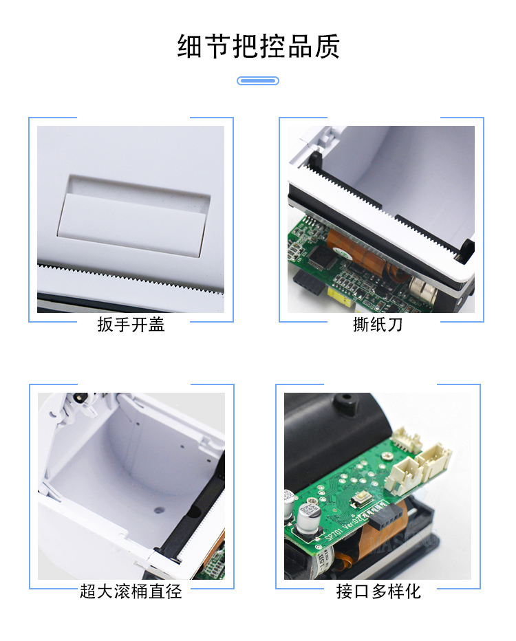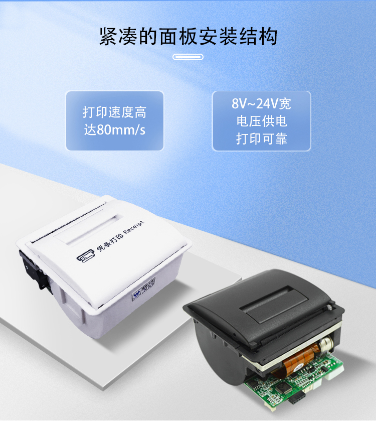 微型打印機(jī)特點(diǎn):前開蓋維護(hù),無(wú)需拆開終端設(shè)備就可實(shí)現(xiàn)換紙和維護(hù),8V~12V低電壓供電58mm打印機(jī),嵌入體積小巧