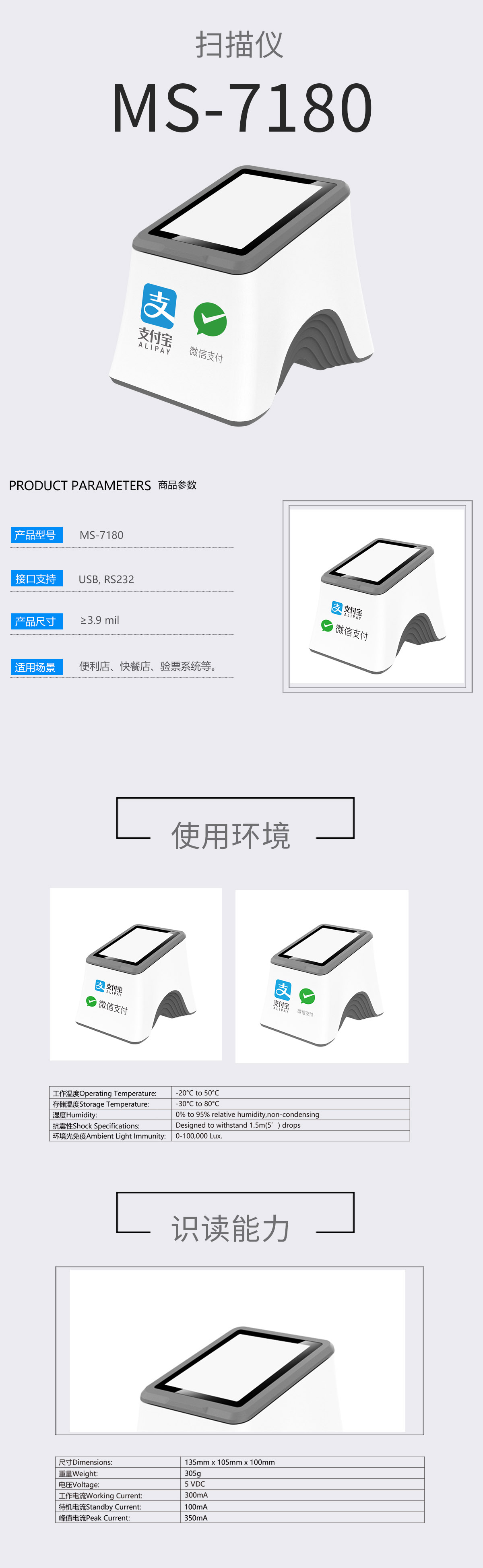 美松二維碼掃描模塊 1.大窗口模式,支持貼屏掃碼,無(wú)需對(duì)準(zhǔn) 2.支持微信,支付寶,美團(tuán)等掃碼支付 3.掃碼成功語(yǔ)音播報(bào),解放收銀員,更避免漏單 4.接口豐富,內(nèi)置RS232 和USB接口 5.經(jīng)典外觀設(shè)計(jì)