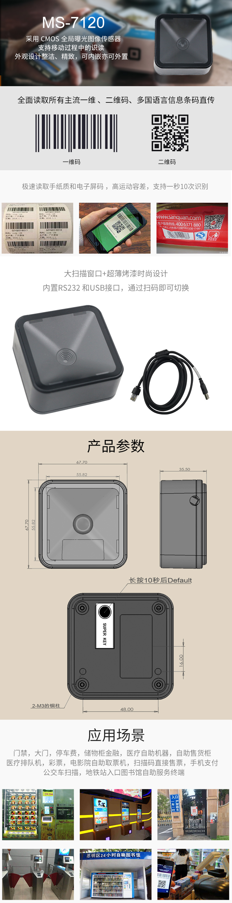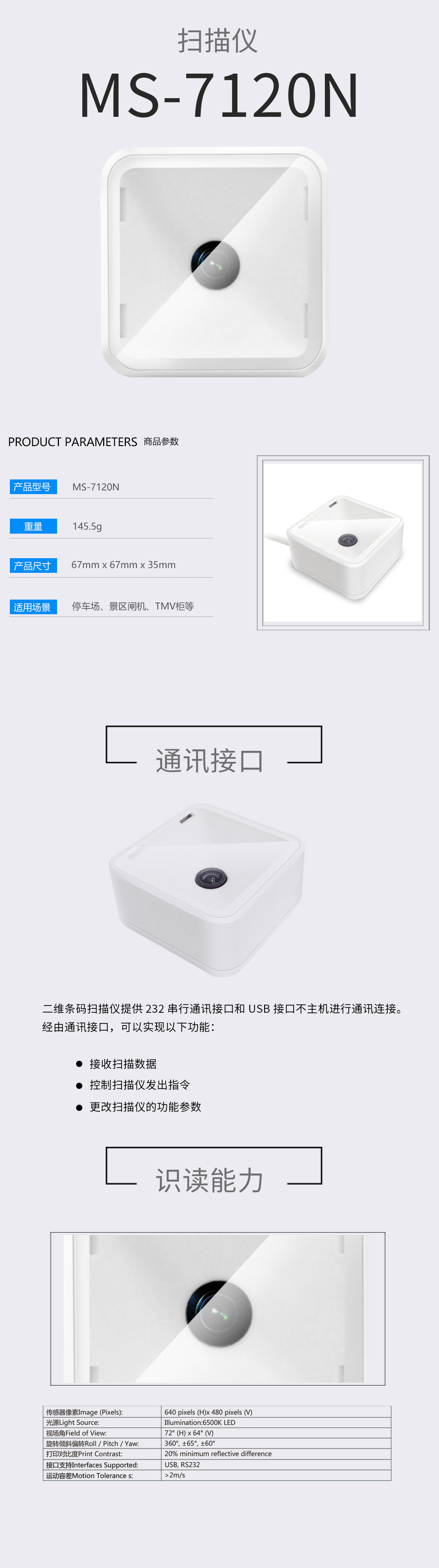 美松二維碼掃描器MS-7120N掃描器采用CMOS全局曝光圖像傳感器,支持移動過程中的識讀,全面兼容主流一維碼,二維碼.同時支持紙質(zhì)條碼和電子屏條碼的識讀.掃描成功有蜂鳴器和指示燈提示,外觀設(shè)計整潔,精致,可內(nèi)嵌亦可外置.MS-7120N二維碼掃描器得益于二維影像技術(shù)及優(yōu)秀的Hercules與專利技術(shù),可以非常容易且準確地識 讀條碼符號,即使條碼符號處于任意旋轉(zhuǎn)角度,都不會影響識讀.在掃碼時,將掃描儀投射的瞄準指示光束對準所需讀取的條碼符號上即可.
