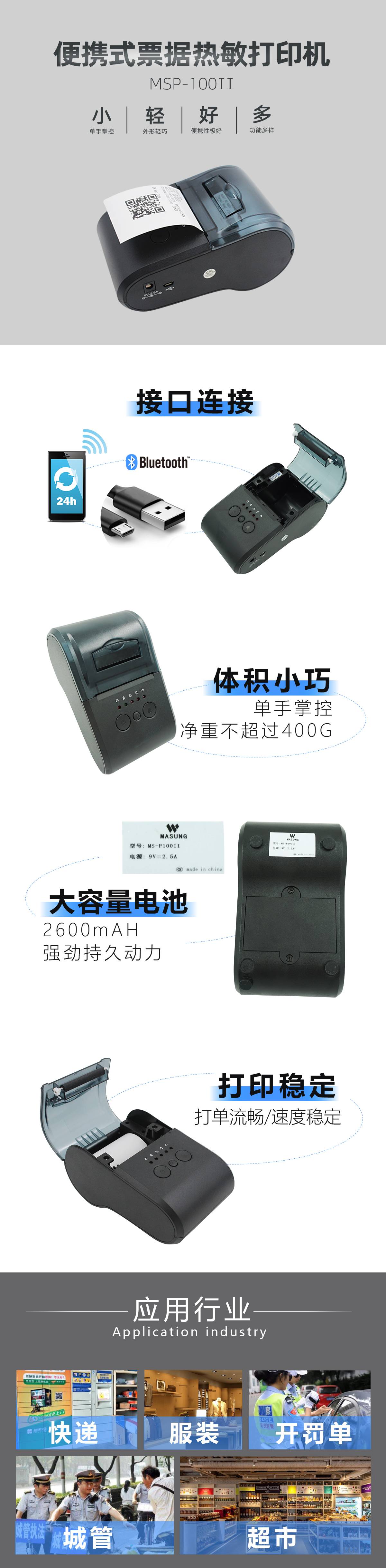 美松MSP-100II系列打印機(jī)是微型熱敏POS小票打印機(jī),支持多種一維條形碼&二維碼功能的打印,支持GB18030漢字庫(kù),可高速打印漢字,接口類型:藍(lán)牙接口,mircoUSB接口.設(shè)計(jì)精巧,性能穩(wěn)定,外觀時(shí)尚.