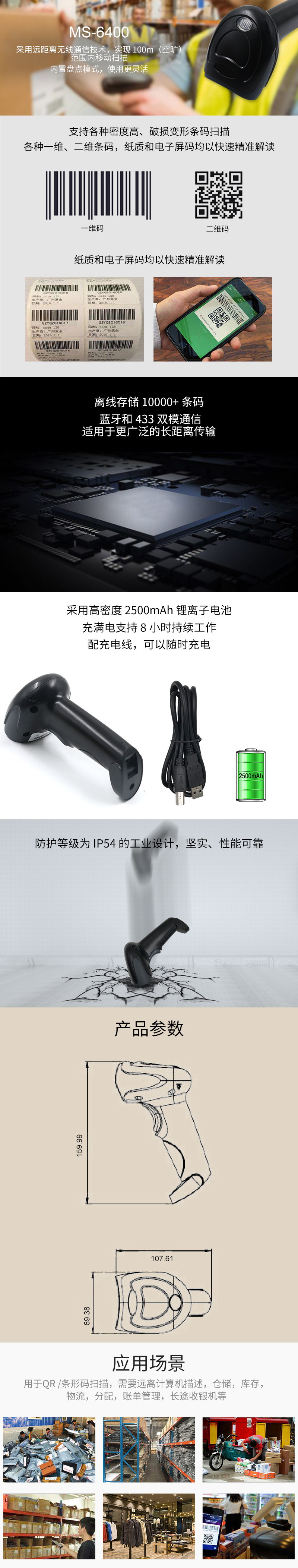 美松一二維碼影像式掃描槍 1.支持2.4G和藍牙無線傳輸,支持感應掃描 2.直接解讀手機和電腦屏幕上的條形碼 3.防護等級為IP54的工業(yè)設計,堅實,性能可靠 4.快速準確的解讀一維和二維條形碼,并且具有良好的糾錯能力 5.長距離傳輸,多國語言條碼信息直傳 6.支持安卓,IOS手機平板直連傳輸 7.2500mAh 連續(xù)掃碼8個小時,低功耗性能強大,支持隨時充電 8.離線存儲10000+條碼