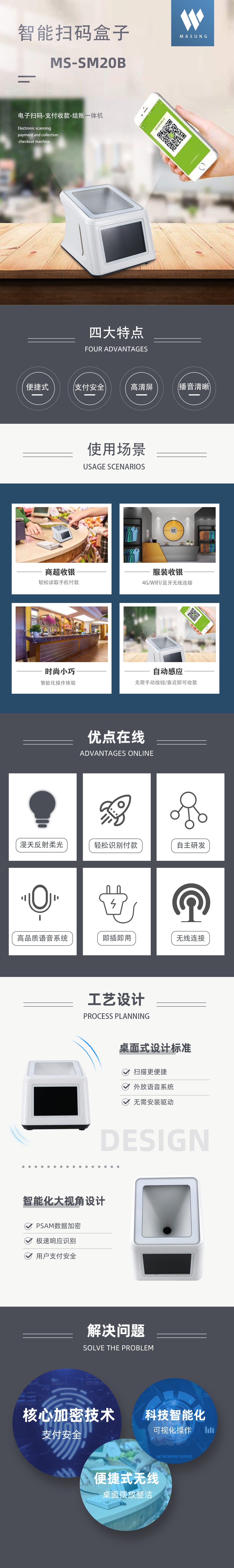 美松二維碼支付收款機(jī)MS-SM20B智能盒子采用掃一掃,二維碼,雙聲道立體音喇叭外放,商家只需用戶提供收款碼就可實現(xiàn)快速收款的收款機(jī),二維碼掃描,對商家收款帶來便利,對用戶二維碼支付提供安全,交易實現(xiàn)快速精準(zhǔn)安全模式.電子掃碼,支付收款,結(jié)賬一體的設(shè)備,支持微信,支付寶,公交碼支付,掃碼成功語音播報 ,解放收銀員,更避免漏單,接口:網(wǎng)口,4G和USB,經(jīng)典外觀設(shè)計.