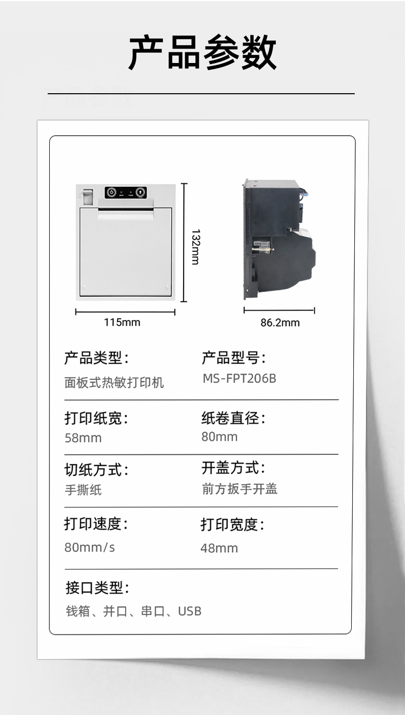 美松MASUNG新推出的58mm面板式熱敏打印機 1.MS-FPT206面框可以兼容80mm打印機安裝尺寸 2.擁有易裝紙、手撕切紙等功能 3.設(shè)計精巧,操作簡易等特點 4.開蓋扳手加軸強度高、黑標(biāo)傳感器(可選)等優(yōu)良特性 5.零售、餐飲、娛樂、醫(yī)療、物流等行業(yè)的自助終端設(shè)備理想打印伙伴