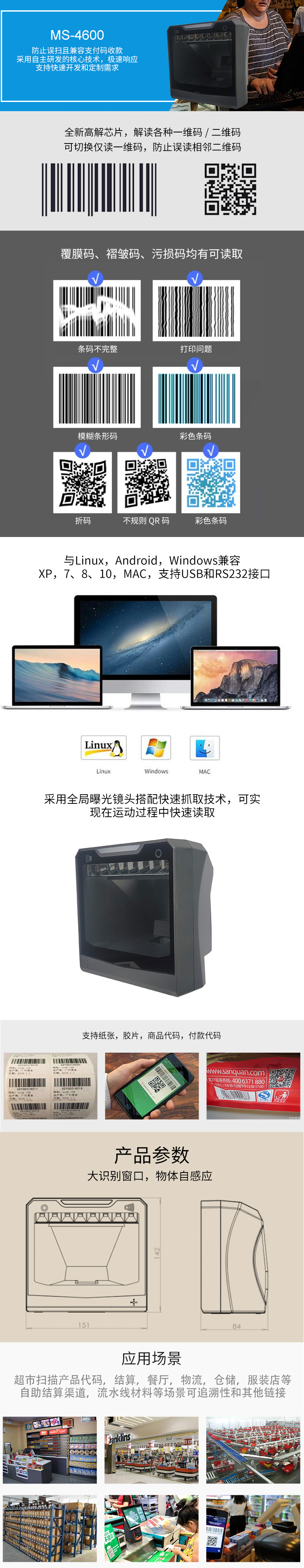 全面支持一維、二維碼;多國語言條碼信息直傳 百萬像素,支持低于4mil條碼識讀 輕松切換一維二維模式 ,避免誤掃 150*155mm窗口,超大真實視場角度 1/100 秒急速掃描,無需對焦 支持紙質(zhì),薄膜類,商品碼,付款碼讀取 支持低對比度、高密度的DM碼等的讀取