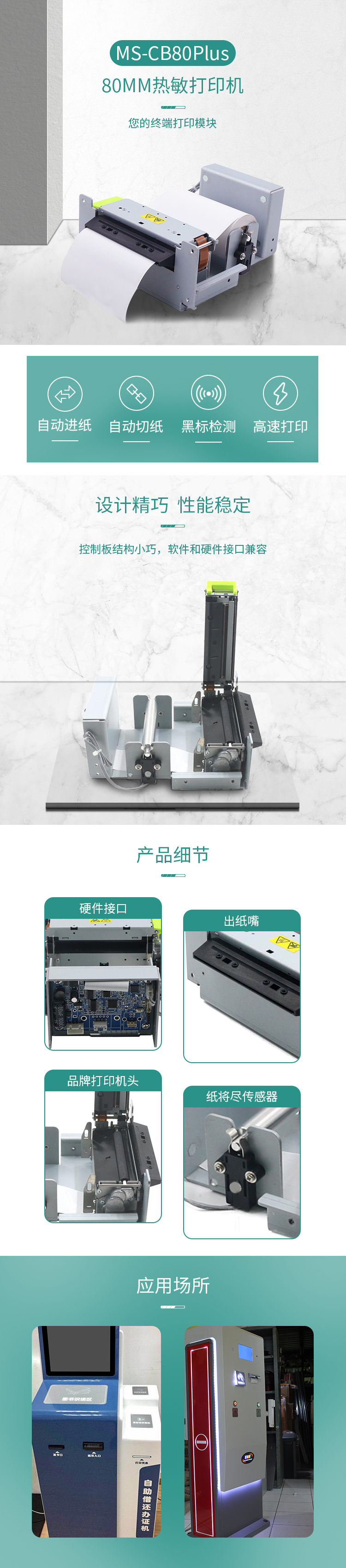 美松(MASUNG)80mm嵌入式熱敏打印機(jī)MS-CB80Plus 1.配置超低出紙口 2.側(cè)翻蓋維護(hù) 3.適用于矮小空間嵌入的打印機(jī) 4.擁有自動切紙、紙將盡、黑標(biāo)檢測等功能,軟件和硬件接口兼容