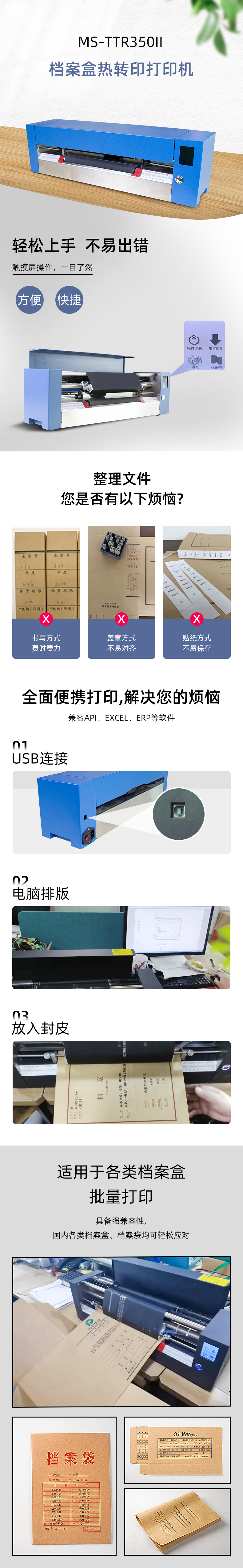 美松MASUNG自主研發(fā)A3+標(biāo)準(zhǔn)檔案盒封面打印機(jī) 1.專業(yè)打印牛皮紙,證件內(nèi)頁,無酸紙檔案盒 2.對接API,EXCEL,ERP等數(shù)據(jù)庫專業(yè)的編輯軟件,自定義打印 3.USB連接操作簡單,耗材成本低,長久保存 4.智能打印,整齊規(guī)范化,助力智慧辦公