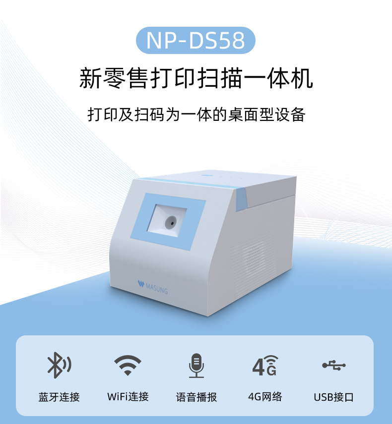 在新零售行業(yè)廣泛應(yīng)用的打印掃描一體機(jī)NP-DS58,同時(shí)兼顧打印和掃描兩種功能的一體式設(shè)備,具有藍(lán)牙連接和wiff連接等連接方式,帶有4G網(wǎng)絡(luò)接口,和USB接口連接,收銀掃碼都十分方便,帶有語(yǔ)音播報(bào)功能,更方便收銀結(jié)賬。