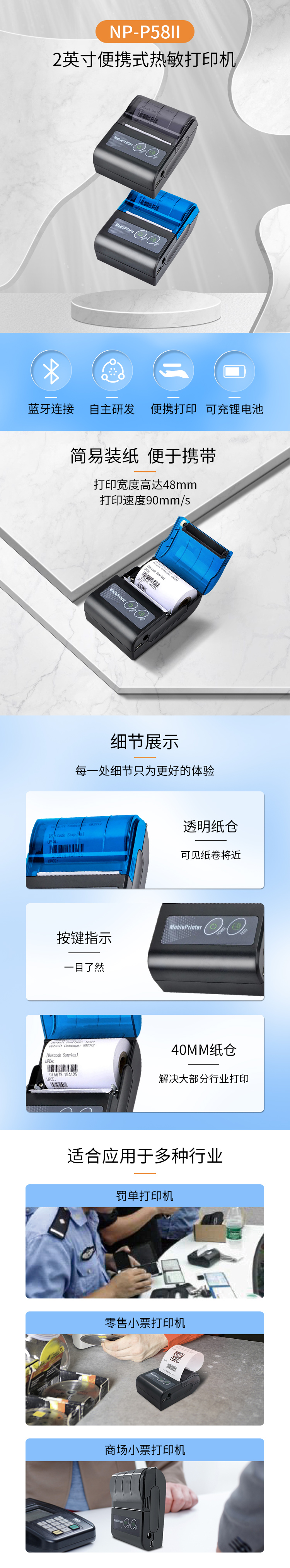 使用58mm的熱敏紙卷打印,可用于多種應(yīng)用場景,餐飲小票,收銀小票,罰單等都可以打印。