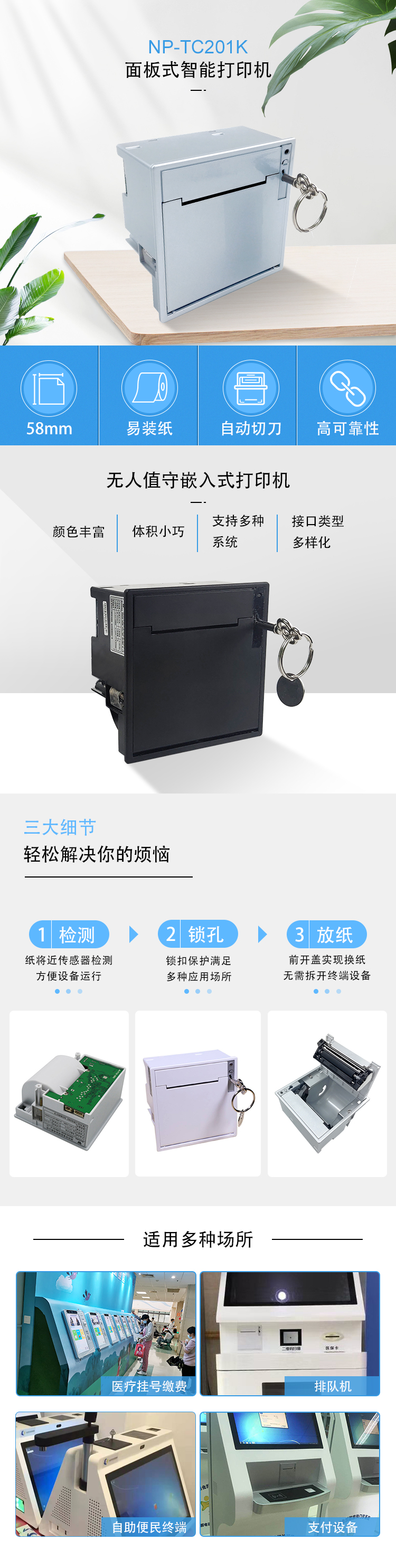 1.前開蓋維護(hù),無需拆開終端設(shè)備就可實現(xiàn)換紙和維護(hù) 2.開蓋方式配置鑰匙,適配無接觸式無人化管理模塊 3.黑白銀三色選項,任意搭配終端,滿足多種場景應(yīng)用
