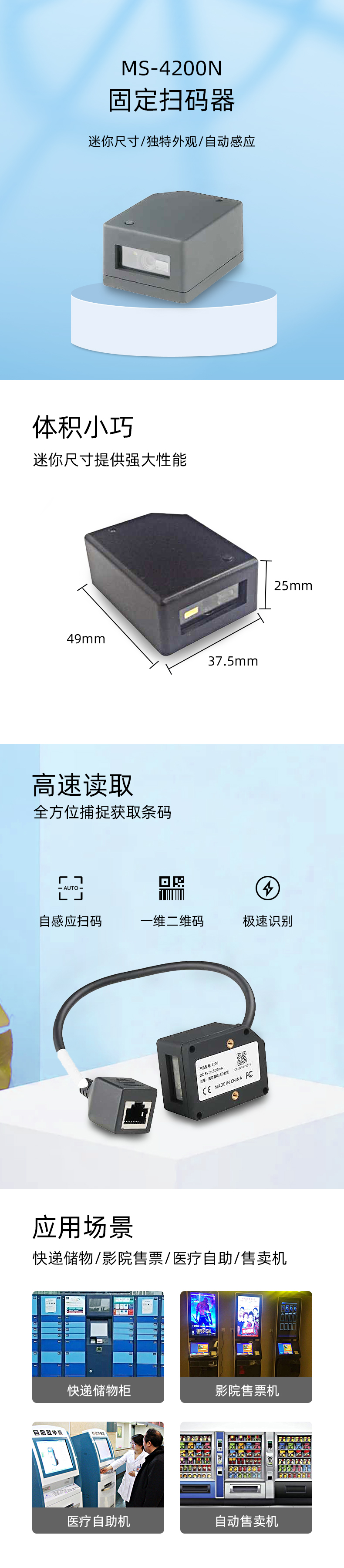 美松嵌入式二維碼條碼掃描器 1.兼容紙質(zhì)和電子屏,一維和二維條碼均可識讀 2.自帶補(bǔ)光燈掃描基準(zhǔn)線,更易掃面單類紙質(zhì)條碼 3.體積非常小巧,非常適合手持機(jī)和空間狹小情況下使用,自帶蜂鳴器提醒