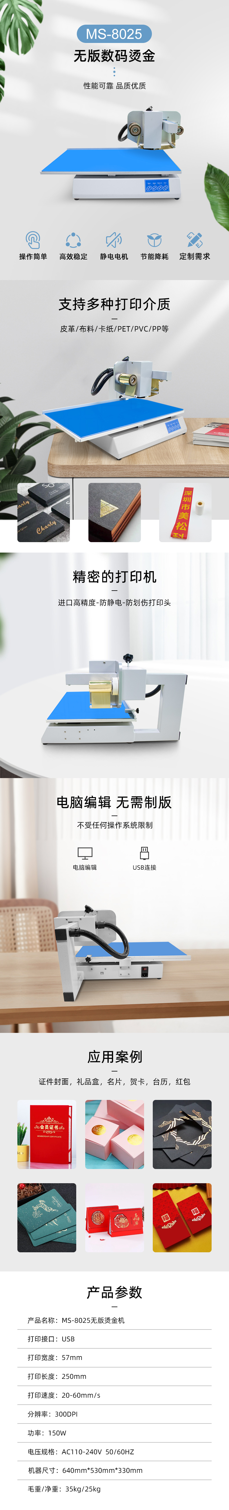美松無版數(shù)碼燙金機MS-8025采用日本原裝rohm打印頭,最新設(shè)計徹底取代傳統(tǒng)的燙金機。身材小巧、節(jié)約空間重量、方便移動;最大打印厚度可達30mm、用途廣泛。軟件控制、可加工復(fù)雜圖案文字照片等,可在不光滑的卡紙、皮革上燙印各種圖案文字。用戶無需制版、開模,功率低,經(jīng)濟快捷,簡單操作,一看即懂,輕松自如。