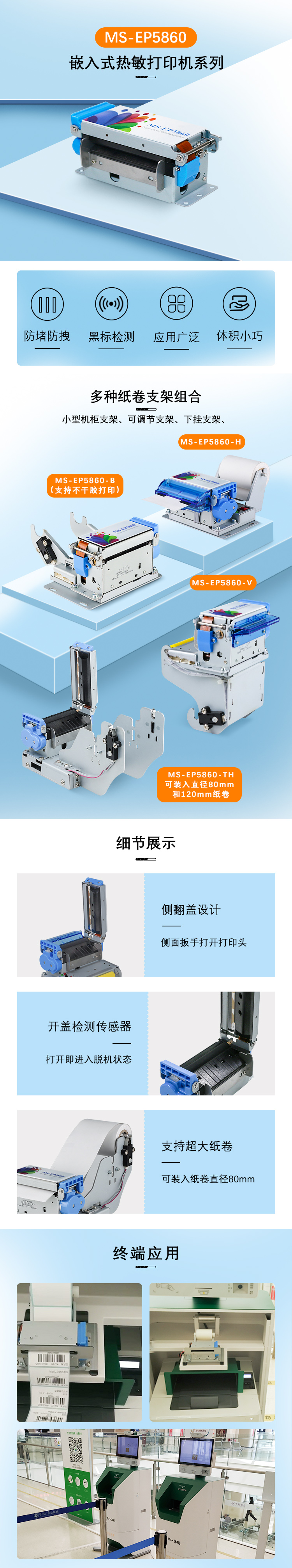 4.兼容各種苛刻的適用環(huán)境,結(jié)構(gòu)設(shè)計(jì)可定制衍生,實(shí)現(xiàn)易維護(hù)易安裝,整機(jī)尺寸小巧靈活,支持紙卷后放MS-EP5860-V或下放MS-EP5860-H結(jié)構(gòu),根據(jù)終端設(shè)備的需求選配。