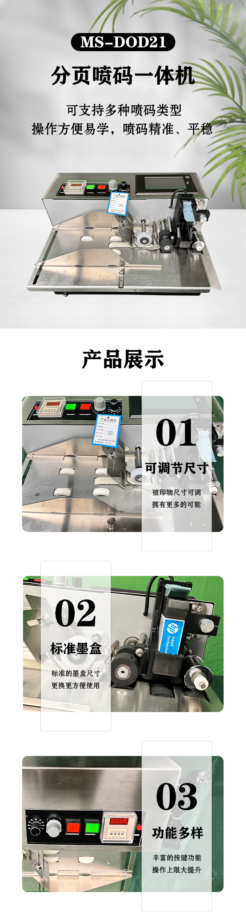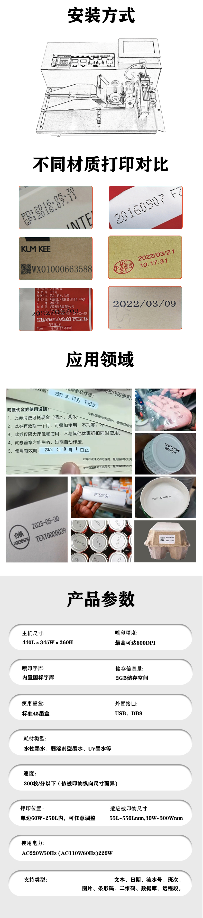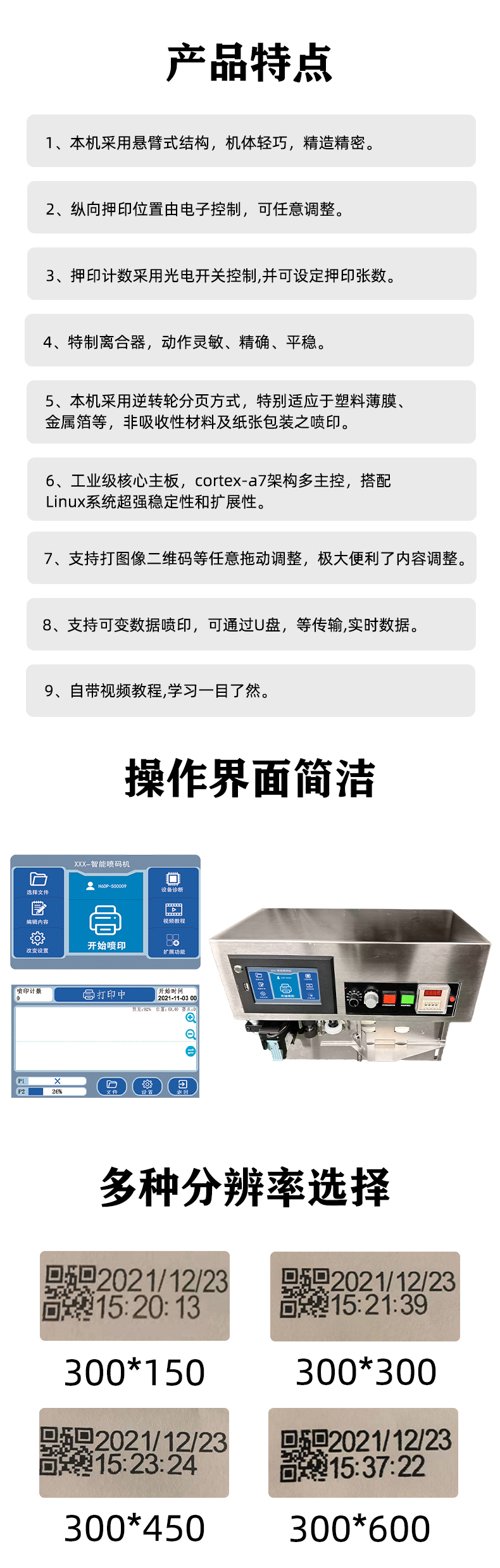 1、本機采用懸臂式結(jié)構(gòu),機體輕巧,精造精密。 2、縱向押印位置由電子控制,可任意調(diào)整。 3、押印計數(shù)采用光電開關控制,并可設定押印張數(shù)。 4、特制離合器,動作靈敏、精確、平穩(wěn)。 5、本機采用逆轉(zhuǎn)輪分頁方式,特別適應于塑料薄膜、 金屬箔等,非吸收性材料及紙張包裝之噴印。 6、工業(yè)級核心主板,cortex-a7架構(gòu)多主控,搭配Linux系統(tǒng)超強穩(wěn)定性和擴展性。 7、支持打圖像二維碼等任意拖動調(diào)整,極大便利了內(nèi)容調(diào)整。8、支持可變數(shù)據(jù)噴印,可通過U盤,等傳輸,實時數(shù)據(jù)。傳輸,實時數(shù)據(jù)。