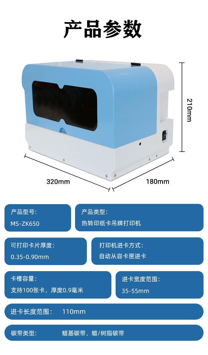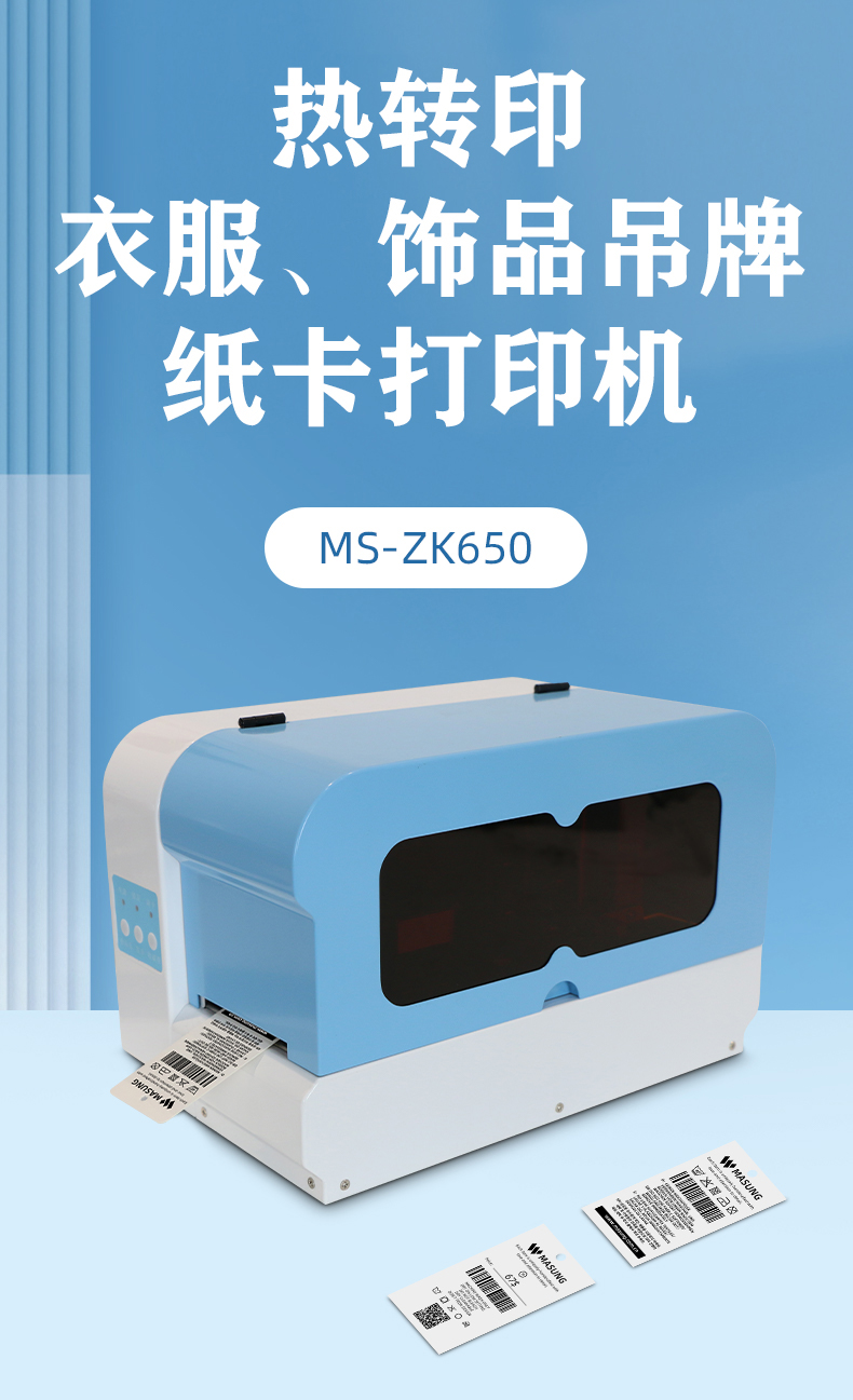 MS-ZK650_熱轉(zhuǎn)印紙卡吊牌打印機(jī),是由美松自主研發(fā)的一款熱轉(zhuǎn)印類型的卡片打印機(jī),主要應(yīng)用于衣物、飾品價(jià)格吊牌或洗滌吊牌的打印,打印的卡寬度在35-55mm之間,最大長(zhǎng)度為110mm,MS-ZK650可打印的最大寬度在55MM,可裝入的紙卡寬度為0.35mm-0.9mm,最大可裝入0.9mm的紙卡100張。