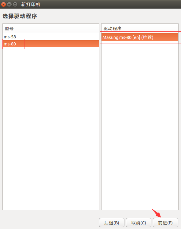 選擇型號以及驅(qū)動程序,然后點擊前進。