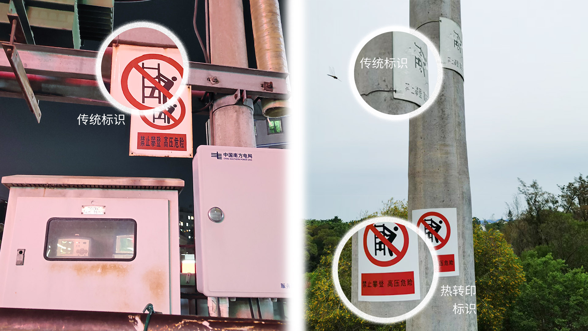 熱轉(zhuǎn)印技術(shù)的創(chuàng)新,在標(biāo)識制作領(lǐng)域掀起了一場變革。傳統(tǒng)搪瓷、鋁合金、不銹鋼標(biāo)識造價高、生產(chǎn)周期長、使用壽命短、不能重復(fù)利用且材料材質(zhì)不統(tǒng)一,給電力電網(wǎng)、鐵路交通、公路等各行業(yè)的標(biāo)識管理帶來巨大困擾。美松通過自主創(chuàng)新,為標(biāo)識應(yīng)用領(lǐng)域帶來了智能、高效、節(jié)約的創(chuàng)新管理模式。下圖是熱轉(zhuǎn)印標(biāo)牌替換傳統(tǒng)工藝制作的標(biāo)牌對比圖。